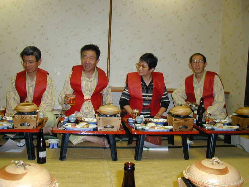 苦心の作、手作りちゃんちゃんこを着ておおいに盛り上がった還暦の宴会です。